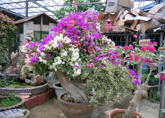 | 栽培のポイント | 陽当たりが良く、水はけ(透水性)の良い場所に植えると花つきが良くなる。花後、切り戻し剪定すること。品種は豊富で、年に1回の開花期のあるものから、1年を通して開花するものまである。周年開花させるのには、通常雨よけの出来るハウス内で鉢植え栽培する。水と肥料の調整で花芽促進を行い、開花させる。根の発達が緩慢なので、品種にもよるが植え替えは数年に1回だけでよく、鉢土を半分交換するだけでも生育はよくなる。誘引の工夫(仕立て方)によって、様々な形を作ることが出来るツル性花木である。 |