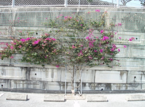 | エピソード | 本当の花はどれ? ブーゲンビレアの花をよく見てください。赤・紫・ピンクに染まっているのは「苞」と呼ばれるもので、本当の花ではありません。葉と同じ脈もあるので違いが分かります。苞の中央に白い小さな筒状のものが、花とガクが一緒になった花です。ブーゲンビレアという名前は、南米のディオネジャネイロで初めてこの植物発見した人の名前です。和名はイカダカズラ「筏葛」と呼びます。県内には黄金色、ピンクと白の咲き分け、八重咲きなど珍しい品種もあります。 |